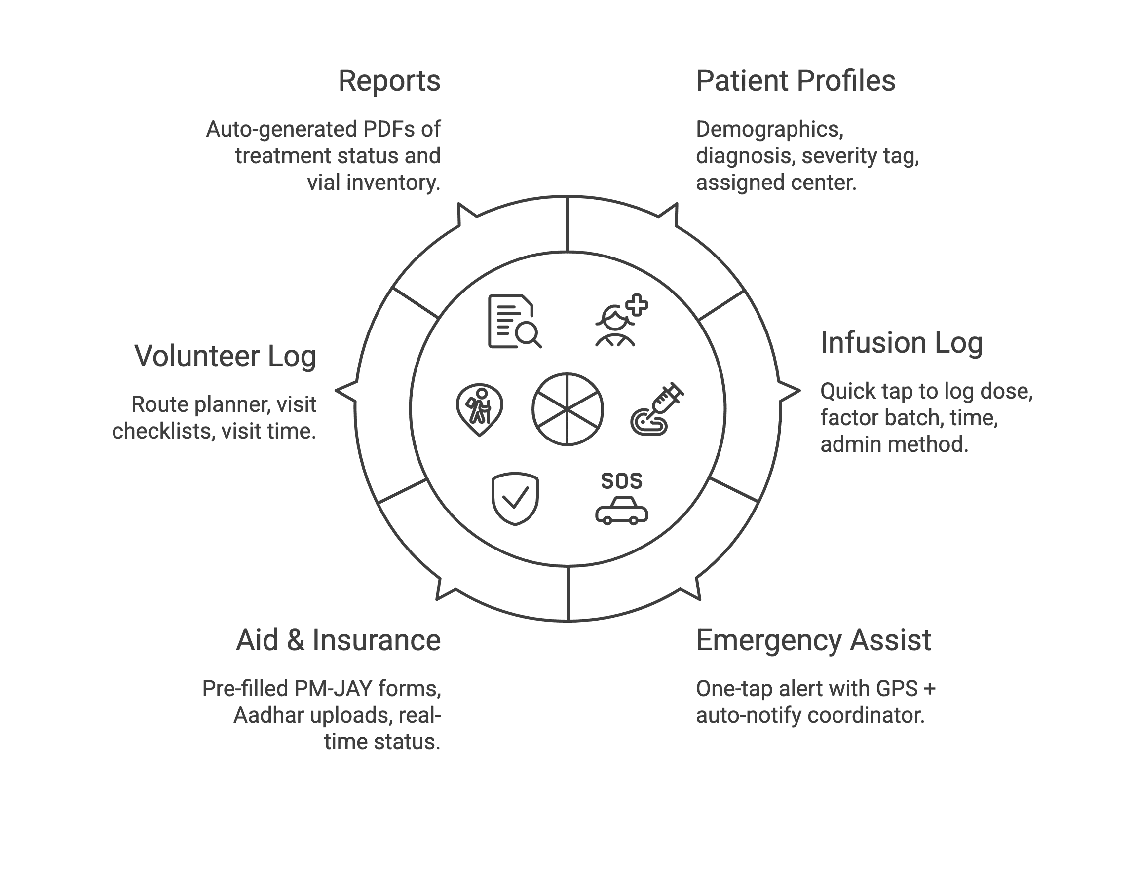 🔹 Aid & Insurance – Pre-filled PM-JAY forms, Aadhar uploads, real-time status